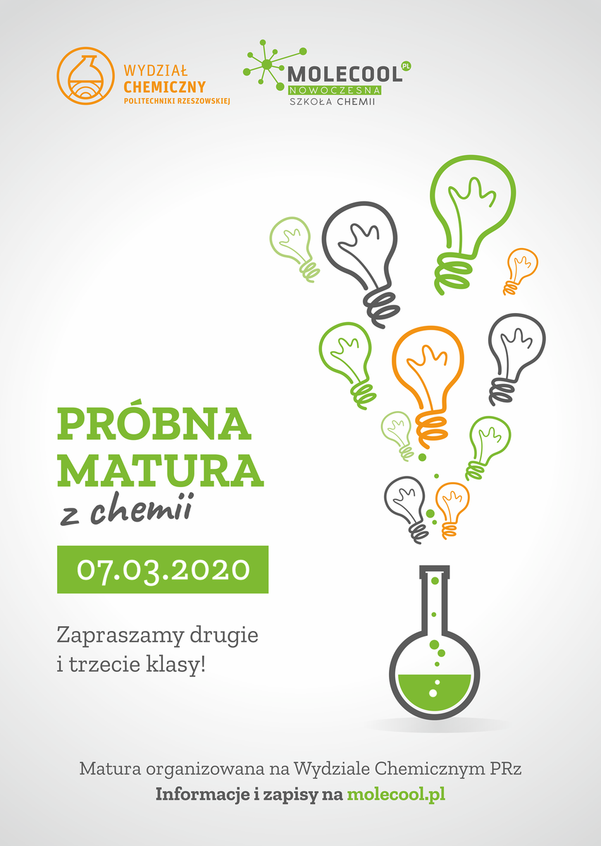W dniu 7 marca br. (sobota) w godz. 11:00-15:00 na Wydziale Chemicznym Politechniki Rzeszowskiej zostanie przeprowadzona II próbna matura z chemii przygotowana przez rzeszowską Szkołę Chemii Molecool.