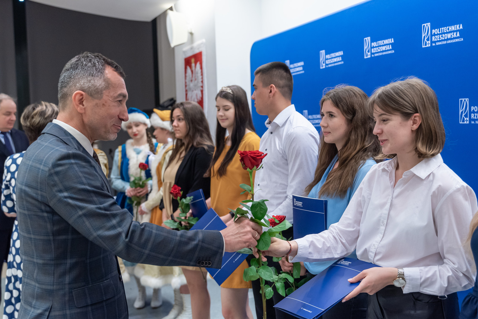 Uroczystość rozpoczęła się miłym artystycznym akcentem, jakim był występem wokalny dwóch wyróżnionych studentek z Wydziału Matematyki i Fizyki Stosowanej – Katarzyny Bieli i Klaudii Bukały. Następnie prorektor ds. kształcenia dr hab. Iwona Włoch, prof. PRz i prorektor ds. studenckich prof. dr hab. Grzegorz Ostasz wręczyli nagrody i lity gratulacyjne studentom. „Razem z panią prof. Iwoną Włoch mamy ogromną satysfakcję, wręczając w imieniu JM Rektora nagrody tak licznej grupie studentów naszej Politechniki. Wyróżnieni zostali nie tylko przedstawiciele wszystkich wydziałów, ale też liderzy Samorządu Studenckiego oraz grupa sportowców reprezentująca Akademicki Związek Sportowy. Wszyscy Państwo świetnie pokazaliście, że można łączyć obowiązki studenta z prawdziwą pasją na różnych płaszczyznach. Serdecznie wszystkim gratulujemy" - powiedział prof. G. Ostasz.