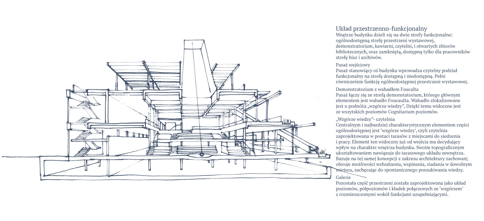 „Zaprojektowany przez nas budynek Cognitarum pozbawiony został cech monumentalnych, lecz dzięki zaproponowanej lokalizacji jest widoczny i staje się subtelną dominantą przestrzenną. Ważnym elementem nadającym charakter budynkowi jest wkomponowana w jego bryłę „latarnia” z wahadłem Foucaulta. Latarnia jest elementem widocznym z daleka, w naturalny sposób budzącym zainteresowanie” – twierdzą autorzy.